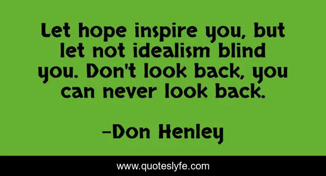 This page presents the quote "Let hope inspire you, but let not idealism blind you. Don't look back, you can never look back.". Author of this quote is Don Henley. This quote is about blind, inspire,.