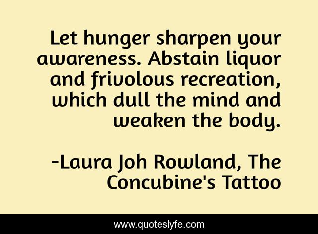 "Laura Joh Rowland, The Concubine's Tattoo Quotes." Quoteslyfe.com, 2025. Mon. 08 Dec. 2025. <https://www.quoteslyfe.com/quote/Let-hunger-sharpen-your-awareness-Abstain-liquor-105996>.