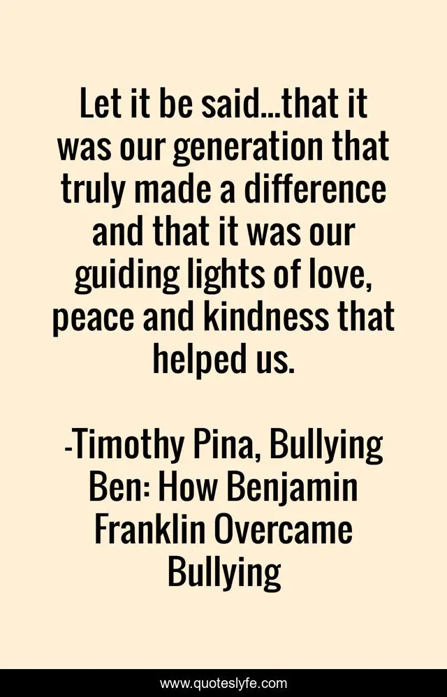 This page presents the quote "Let it be said...that it was our generation that truly made a difference and that it was our guiding lights of love, peace and kindness that helped us.". Author of this quote is Timothy Pina, Bullying Ben: How Benjamin Franklin Overcame Bullying. This quote is about revoultionary-tails, bullying-ben, no-more-bullying, peace, legend-of-the-peace-panda, love, humanity, affection,.