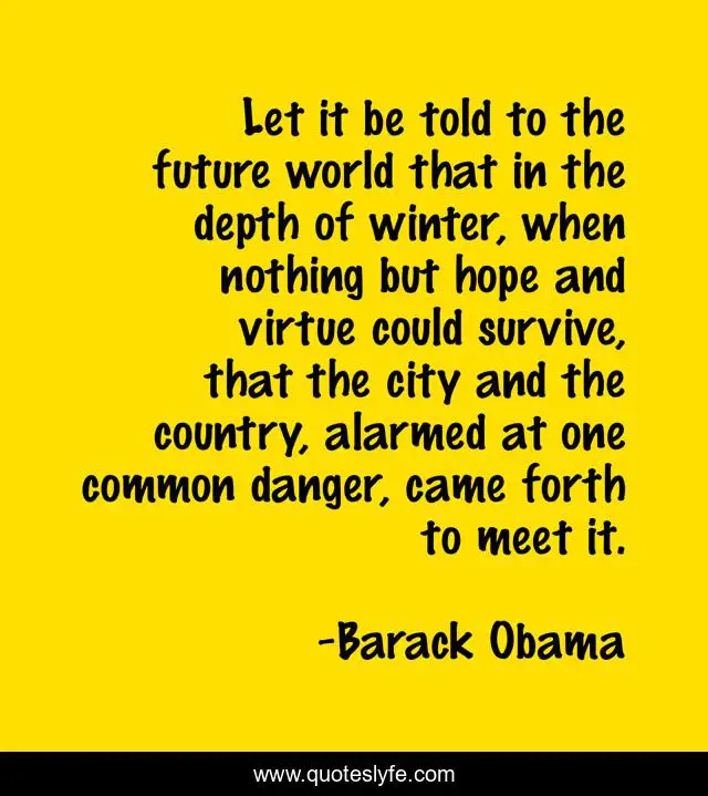 This page presents the quote "Let it be told to the future world that in the depth of winter, when nothing but hope and virtue could survive, that the city and the country, alarmed at one common danger, came forth to meet it.". Author of this quote is Barack Obama. This quote is about inauguration, america, inspiration,.