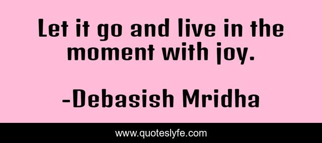 This page presents the quote "Let it go and live in the moment with joy.". Author of this quote is Debasish Mridha. This quote is about let-it-go, joy, philosophy, debasish-mridha, quotes, inspirational, enthusiasm, debasish-mridha-m-d, live-in-the-moment,.