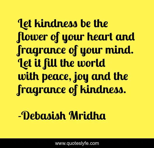 This page presents the quote "Let kindness be the flower of your heart and fragrance of your mind. Let it fill the world with peace, joy and the fragrance of kindness.". Author of this quote is Debasish Mridha. This quote is about heart, flower, mridha, debasish, debasish-mridha, fill-the-world-with-peace, fragrance, kindness, philosophy,.