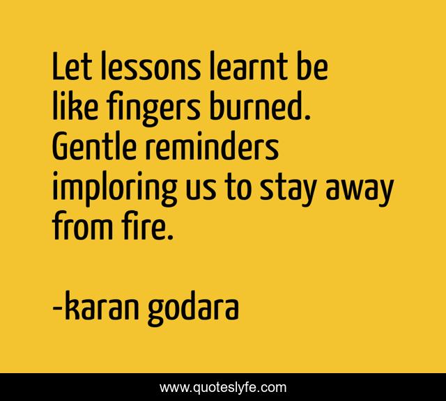 This page presents the quote "Let lessons learnt be like fingers burned. Gentle reminders imploring us to stay away from fire.". Author of this quote is karan godara. This quote is about confidence, positive, motivational, optimistic, inspirational, enthusiasm, philosophy-of-life,.