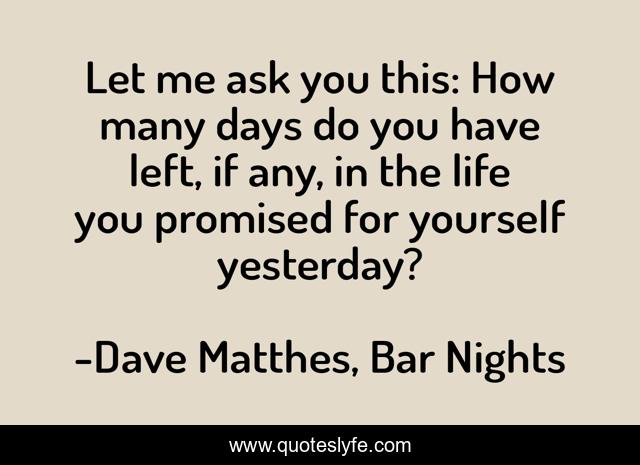 This page presents the quote "Let me ask you this: How many days do you have left, if any, in the life you promised for yourself yesterday?". Author of this quote is Dave Matthes, Bar Nights. This quote is about death, half-empty, daydreaming, half-full, booze, bottle, ambition, alcoholism, destruction,.