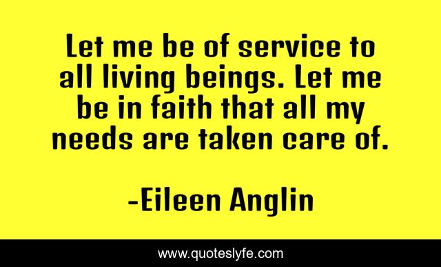This page presents the quote "Let me be of service to all living beings. Let me be in faith that all my needs are taken care of.". Author of this quote is Eileen Anglin. This quote is about spiritual, service-to-mankind, peace, wisdom, service-to-others, prayer,.