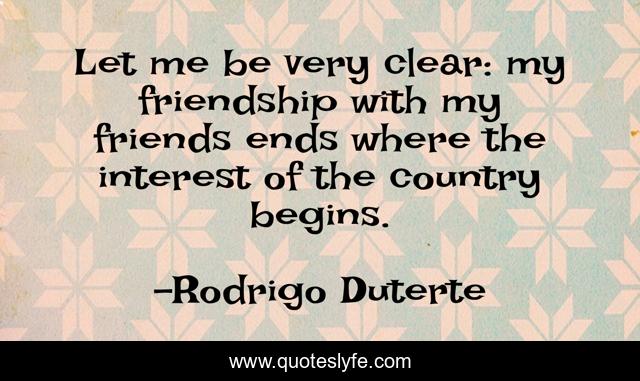 This page presents the quote "Let me be very clear: my friendship with my friends ends where the interest of the country begins.". Author of this quote is Rodrigo Duterte. This quote is about me, country, friends,.