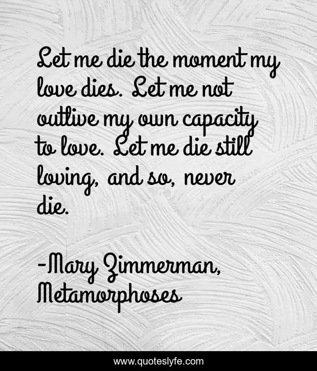 This page presents the quote "Let me die the moment my love dies. Let me not outlive my own capacity to love. Let me die still loving, and so, never die.". Author of this quote is Mary Zimmerman, Metamorphoses. This quote is about die, love, affection,.