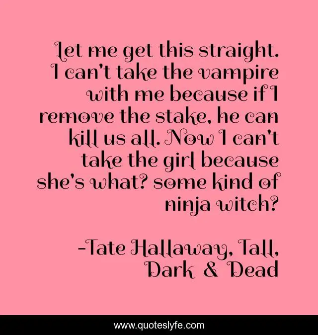 This page presents the quote "Let me get this straight. I can't take the vampire with me because if I remove the stake, he can kill us all. Now I can't take the girl because she's what? some kind of ninja witch?". Author of this quote is Tate Hallaway, Tall, Dark & Dead. This quote is about funny, tall-dark-and-dead, comedy, tate-hallway,.