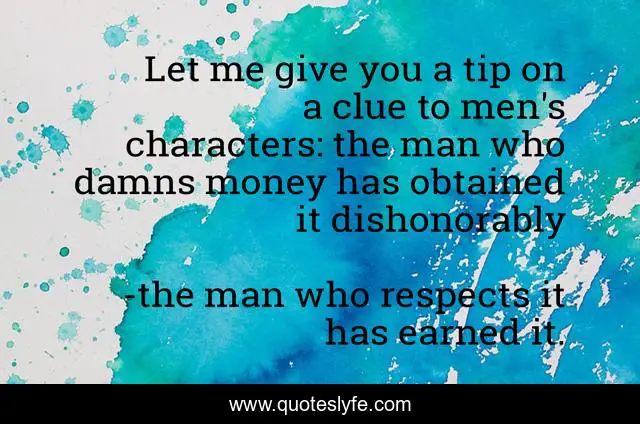 This page presents the quote "Let me give you a tip on a clue to men's characters: the man who damns money has obtained it dishonorably". Author of this quote is the man who respects it has earned it.. This quote is about ayn rand, atlas shrugged,.