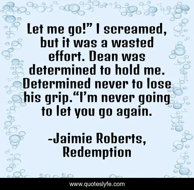This page presents the quote "Let me go!” I screamed, but it was a wasted effort. Dean was determined to hold me. Determined never to lose his grip.“I’m never going to let you go again.". Author of this quote is Jaimie Roberts, Redemption. This quote is about romance, erotic-romance, erotica,.