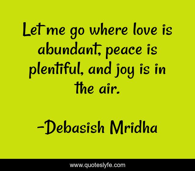 This page presents the quote "Let me go where love is abundant, peace is plentiful, and joy is in the air.". Author of this quote is Debasish Mridha. This quote is about debasish, love, joy, philosophy, debasish-mridha, peace-is-plentiful, love-is-abundant, mridha, abundant,.
