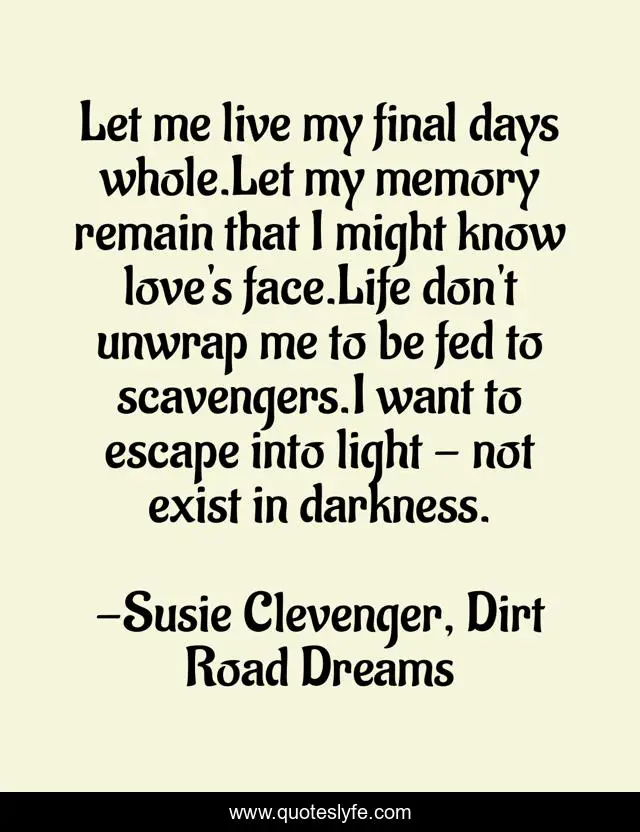 This page presents the quote "Let me live my final days whole.Let my memory remain that I might know love's face.Life don't unwrap me to be fed to scavengers.I want to escape into light - not exist in darkness.". Author of this quote is Susie Clevenger, Dirt Road Dreams. This quote is about living, life, death, love, beauty, light, poetry, affection,.