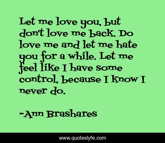 This page presents the quote "Let me love you, but don't love me back. Do love me and let me hate you for a while. Let me feel like I have some control, because I know I never do.". Author of this quote is Ann Brashares. This quote is about love, passion, affection,.