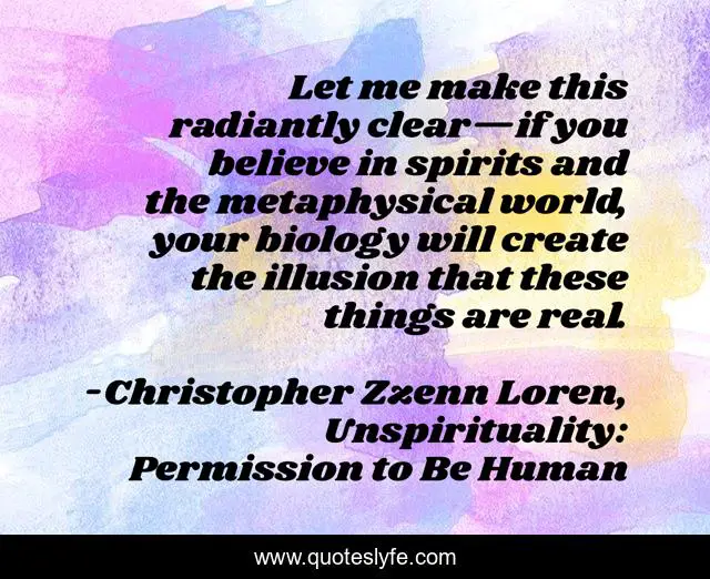 This page presents the quote "Let me make this radiantly clear—if you believe in spirits and the metaphysical world, your biology will create the illusion that these things are real.". Author of this quote is Christopher Zzenn Loren, Unspirituality: Permission to Be Human. This quote is about religion, christianity, atheism, spirituality, unspirituality, naturalism,.