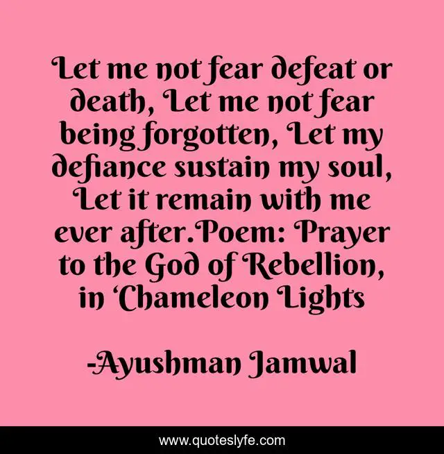This page presents the quote "Let me not fear defeat or death, Let me not fear being forgotten, Let my defiance sustain my soul, Let it remain with me ever after.Poem: Prayer to the God of Rebellion, in ‘Chameleon Lights". Author of this quote is Ayushman Jamwal. This quote is about death, god, defeat, poetry, rebellion, prayer, soul, chameleon-lights, defiance,.
