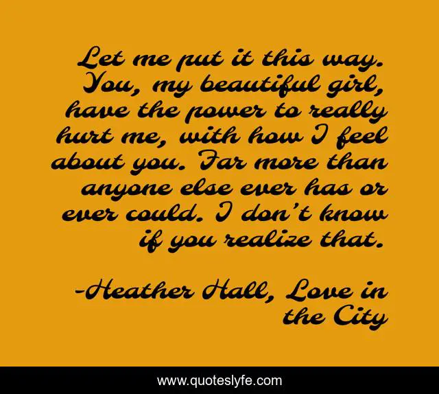 This page presents the quote "Let me put it this way. You, my beautiful girl, have the power to really hurt me, with how I feel about you. Far more than anyone else ever has or ever could. I don’t know if you realize that.". Author of this quote is Heather Hall, Love in the City. This quote is about erotic-romance, love, contemporary-romance, romance, romantic-suspense, erotica, affection,.