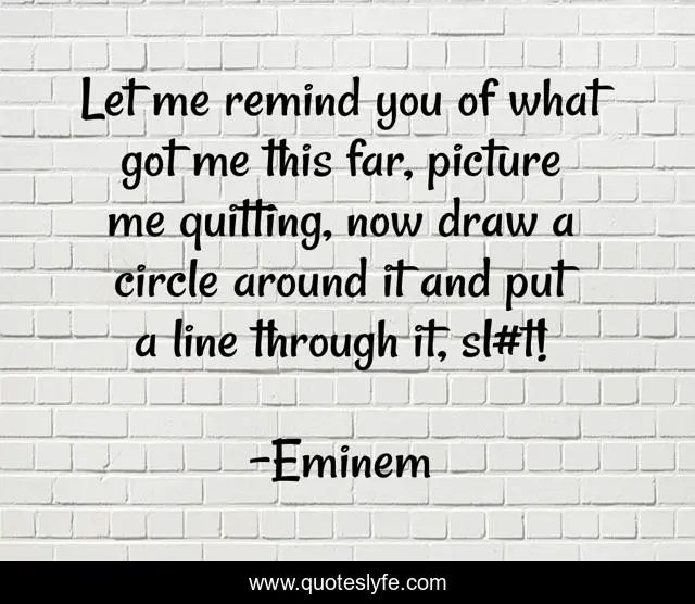 This page presents the quote "Let me remind you of what got me this far, picture me quitting, now draw a circle around it and put a line through it, sl#t!". Author of this quote is Eminem. This quote is about never-quit, success,.
