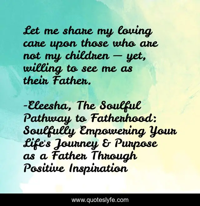 This page presents the quote "Let me share my loving care upon those who are not my children — yet, willing to see me as their Father.". Author of this quote is Eleesha, The Soulful Pathway to Fatherhood: Soulfully Empowering Your Life's Journey & Purpose as a Father Through Positive Inspiration. This quote is about empowerment, fatherhood-parenting, positive, motivational, father, soul, quotes, optimistic, inspirational,.
