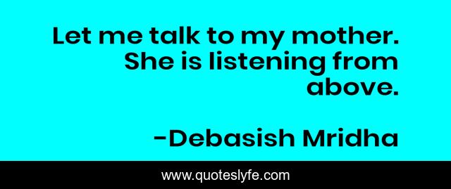 This page presents the quote "Let me talk to my mother. She is listening from above.". Author of this quote is Debasish Mridha. This quote is about listening-from-above, debasish, mridha, missing-mother, philosophy, debasish-mridha, talk-to-my-mother, mother,.