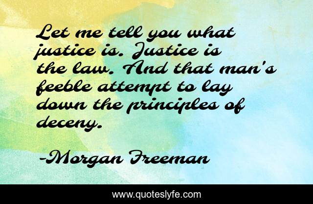 This page presents the quote "Let me tell you what justice is. Justice is the law. And that man's feeble attempt to lay down the principles of deceny.". Author of this quote is Morgan Freeman. .