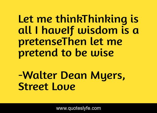 This page presents the quote "Let me thinkThinking is all I haveIf wisdom is a pretenseThen let me pretend to be wise". Author of this quote is Walter Dean Myers, Street Love. This quote is about thinking, wise,.