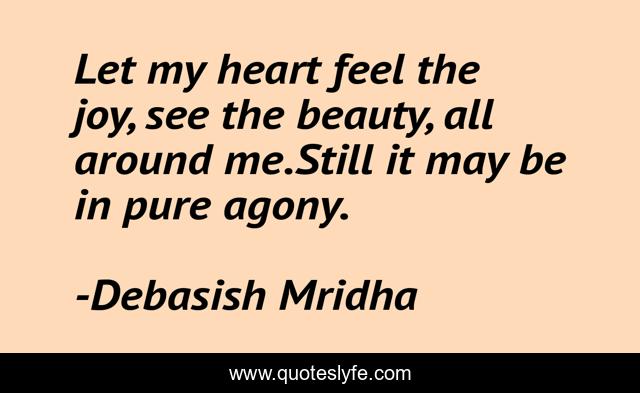 This page presents the quote "Let my heart feel the joy, see the beauty, all around me.Still it may be in pure agony.". Author of this quote is Debasish Mridha. This quote is about life, love, knowledge, inspirational, intelligence, philosophy, wisdom, quotes, affection,.