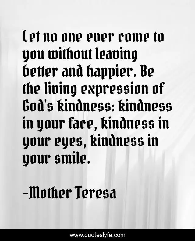 This page presents the quote "Let no one ever come to you without leaving better and happier. Be the living expression of God's kindness: kindness in your face, kindness in your eyes, kindness in your smile.". Author of this quote is Mother Teresa. .