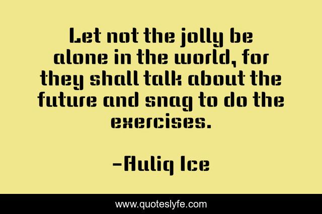 This page presents the quote "Let not the jolly be alone in the world, for they shall talk about the future and snag to do the exercises.". Author of this quote is Auliq Ice. This quote is about hard-work, lazy-people, loneliness, failure-is-not-an-option, lazyness, lonely-people,.