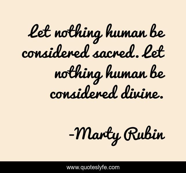This page presents the quote "Let nothing human be considered sacred. Let nothing human be considered divine.". Author of this quote is Marty Rubin. This quote is about the-sacred, the-divine, fallibility, humanity, imperfection,.