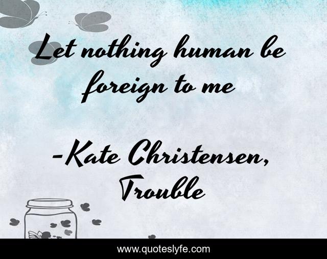 This page presents the quote "Let nothing human be foreign to me". Author of this quote is Kate Christensen, Trouble. This quote is about acceptance, embracing-life, courage,.