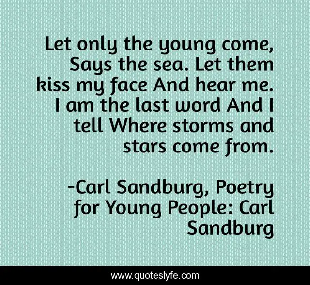 This page presents the quote "Let only the young come, Says the sea. Let them kiss my face And hear me. I am the last word And I tell Where storms and stars come from.". Author of this quote is Carl Sandburg, Poetry for Young People: Carl Sandburg. This quote is about poetry, sea, ocean,.