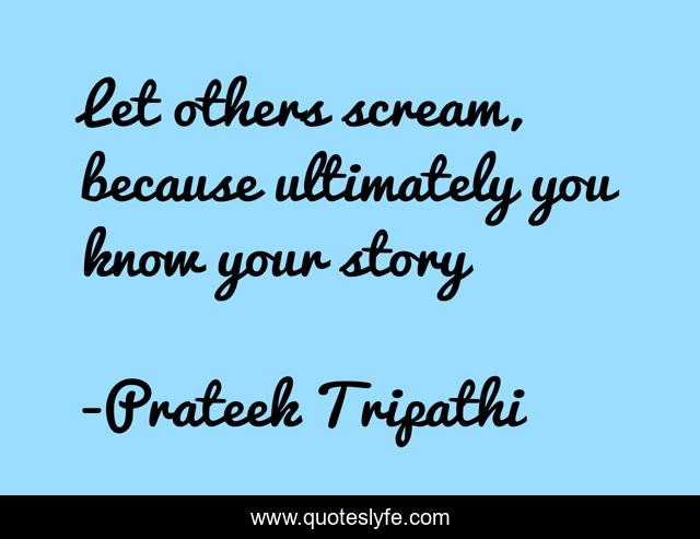 This page presents the quote "Let others scream, because ultimately you know your story". Author of this quote is Prateek Tripathi. This quote is about independent, life, humor, belief, power, positive, motivational, confidence, selflove,.