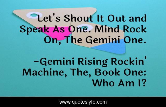 This page presents the quote "Let's Shout It Out and Speak As One. Mind Rock On, The Gemini One.". Author of this quote is Gemini Rising Rockin' Machine, The, Book One: Who Am I?. This quote is about mind-rockin, music, lyrics,.