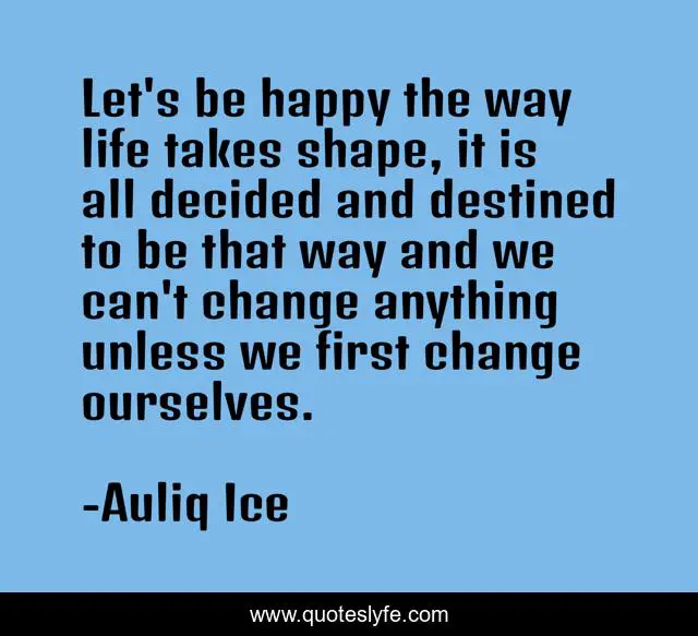 This page presents the quote "Let's be happy the way life takes shape, it is all decided and destined to be that way and we can't change anything unless we first change ourselves.". Author of this quote is Auliq Ice. This quote is about joy, change-your-life, happiness, progress,.