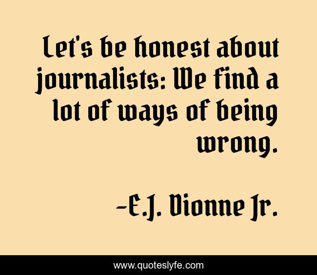 This page presents the quote "Let's be honest about journalists: We find a lot of ways of being wrong.". Author of this quote is E.J. Dionne Jr.. This quote is about being-wrong, journalism, journalists, accuracy,.