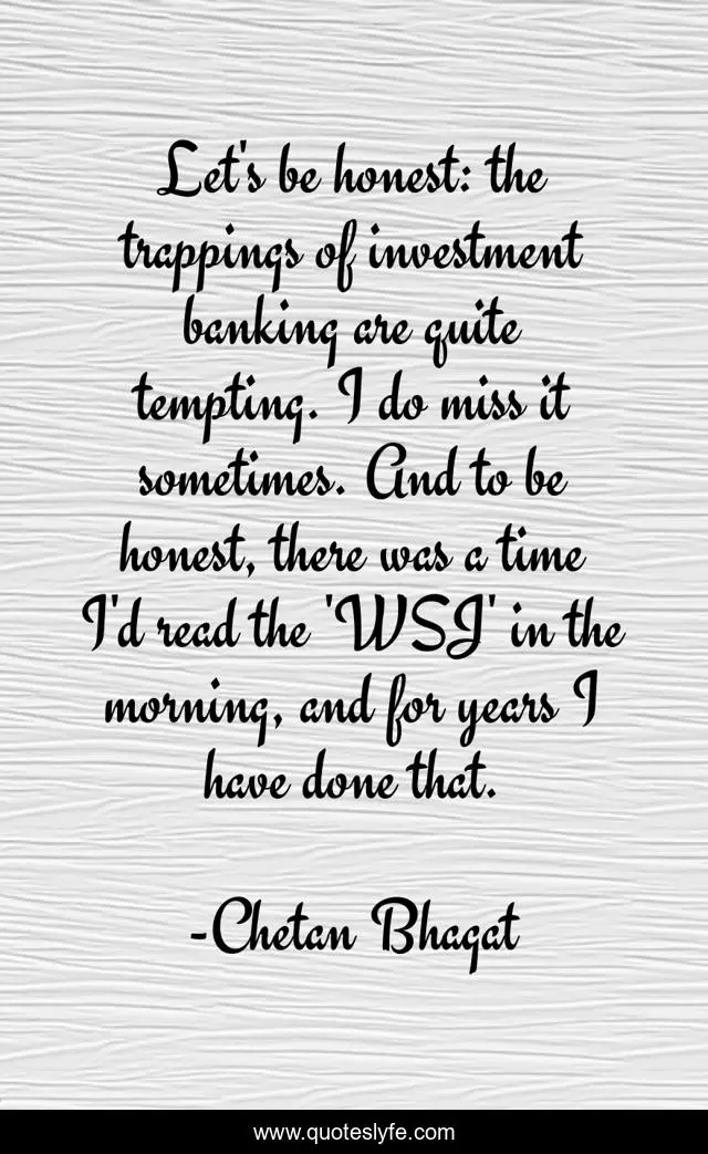 This page presents the quote "Let's be honest: the trappings of investment banking are quite tempting. I do miss it sometimes. And to be honest, there was a time I'd read the 'WSJ' in the morning, and for years I have done that.". Author of this quote is Chetan Bhagat. This quote is about done, investment, time,.