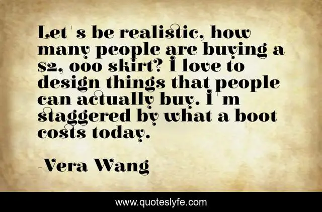 This page presents the quote "Let's be realistic, how many people are buying a $2, 000 skirt? I love to design things that people can actually buy. I'm staggered by what a boot costs today.". Author of this quote is Vera Wang. This quote is about love, today, affection, people,.