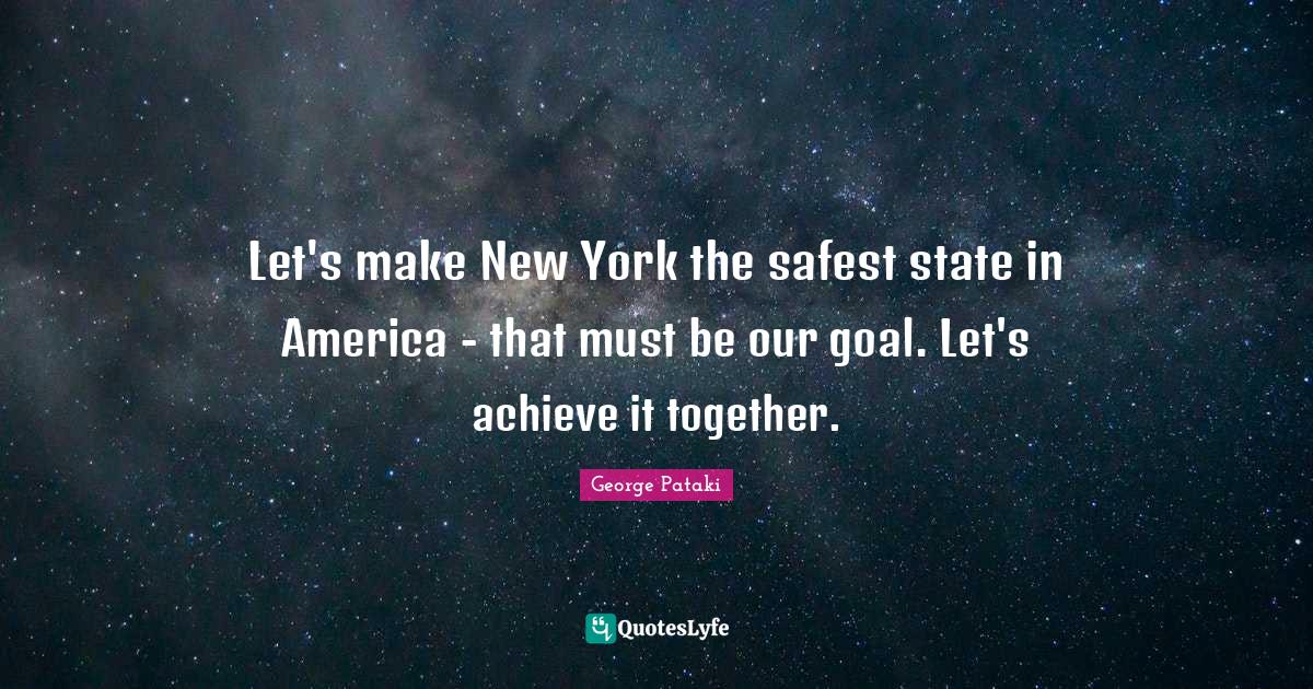 This page presents the quote "Let's make New York the safest state in America - that must be our goal. Let's achieve it together.". Author of this quote is George Pataki. This quote is about achieve, goal, together, america, new york,.