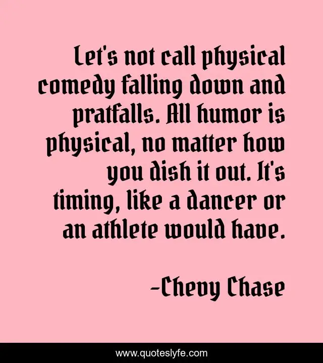 This page presents the quote "Let's not call physical comedy falling down and pratfalls. All humor is physical, no matter how you dish it out. It's timing, like a dancer or an athlete would have.". Author of this quote is Chevy Chase. This quote is about timing, comedy,.