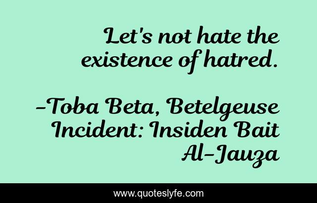 This page presents the quote "Let's not hate the existence of hatred.". Author of this quote is Toba Beta, Betelgeuse Incident: Insiden Bait Al-Jauza. This quote is about life, creation, acceptance, existence, hatred, hate,.