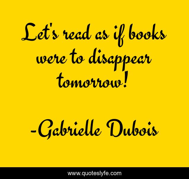 This page presents the quote "Let's read as if books were to disappear tomorrow!". Author of this quote is Gabrielle Dubois. This quote is about tomorrow, last-chance, disappearance, read, last-book, books, last-chance-to-read, to-be-read, reader,.