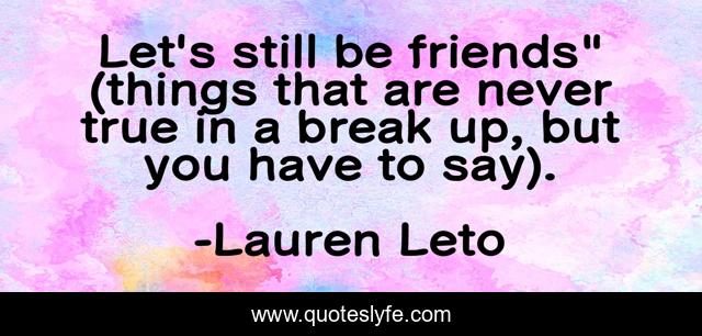 This page presents the quote "Let's still be friends" (things that are never true in a break up, but you have to say).". Author of this quote is Lauren Leto. This quote is about romance, break-ups, friendships, love, affection,.