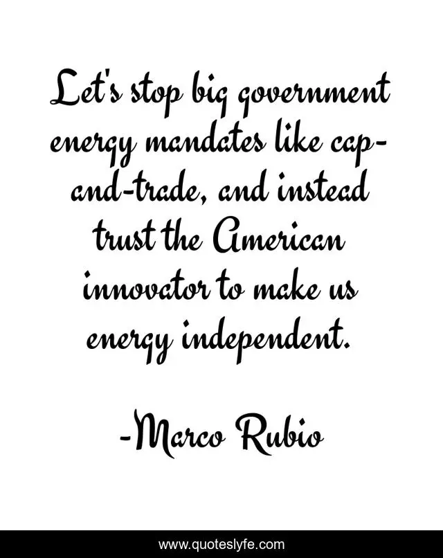 This page presents the quote "Let's stop big government energy mandates like cap-and-trade, and instead trust the American innovator to make us energy independent.". Author of this quote is Marco Rubio. This quote is about american, energy, government,.