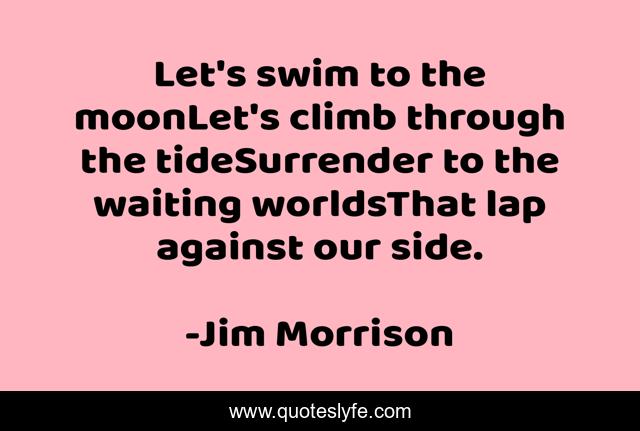 This page presents the quote "Let's swim to the moonLet's climb through the tideSurrender to the waiting worldsThat lap against our side.". Author of this quote is Jim Morrison. This quote is about water, tides, moon, lyrics, song,.