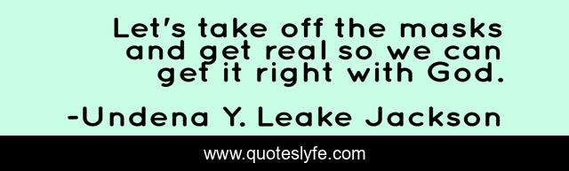 This page presents the quote "Let's take off the masks and get real so we can get it right with God.". Author of this quote is Undena Y. Leake Jackson. This quote is about faith, god, christianity, healing, transparency, spiritual-healing, deliverance,.