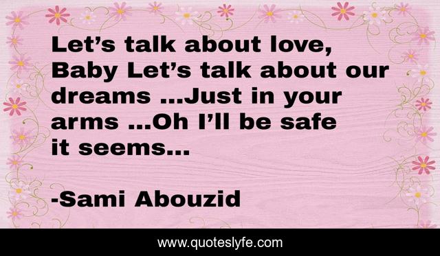 This page presents the quote "Let’s talk about love, Baby Let’s talk about our dreams ...Just in your arms ...Oh I’ll be safe it seems…". Author of this quote is Sami Abouzid. This quote is about love, affection,.