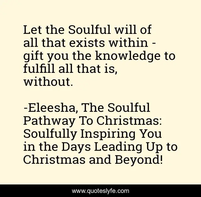 This page presents the quote "Let the Soulful will of all that exists within - gift you the knowledge to fulfill all that is, without.". Author of this quote is Eleesha, The Soulful Pathway To Christmas: Soulfully Inspiring You in the Days Leading Up to Christmas and Beyond!. This quote is about christmas-spirit, positive, motivational, empowerment, soul, quotes, channeling, inspirational, affirmations,.