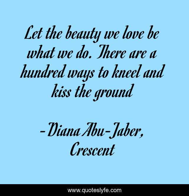 This page presents the quote "Let the beauty we love be what we do. There are a hundred ways to kneel and kiss the ground". Author of this quote is Diana Abu-Jaber, Crescent. This quote is about love, beauty, affection,.