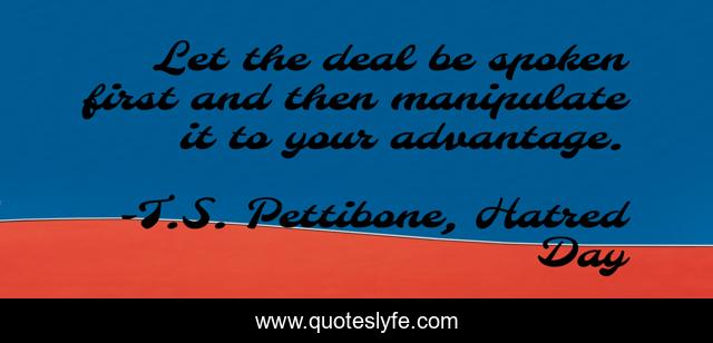 This page presents the quote "Let the deal be spoken first and then manipulate it to your advantage.". Author of this quote is T.S. Pettibone, Hatred Day. This quote is about horror, young-adult-romance, science-fiction, fantasy, young-adult-science-fiction, young-adult-horror, young-adult, young-adult-fantasy,.