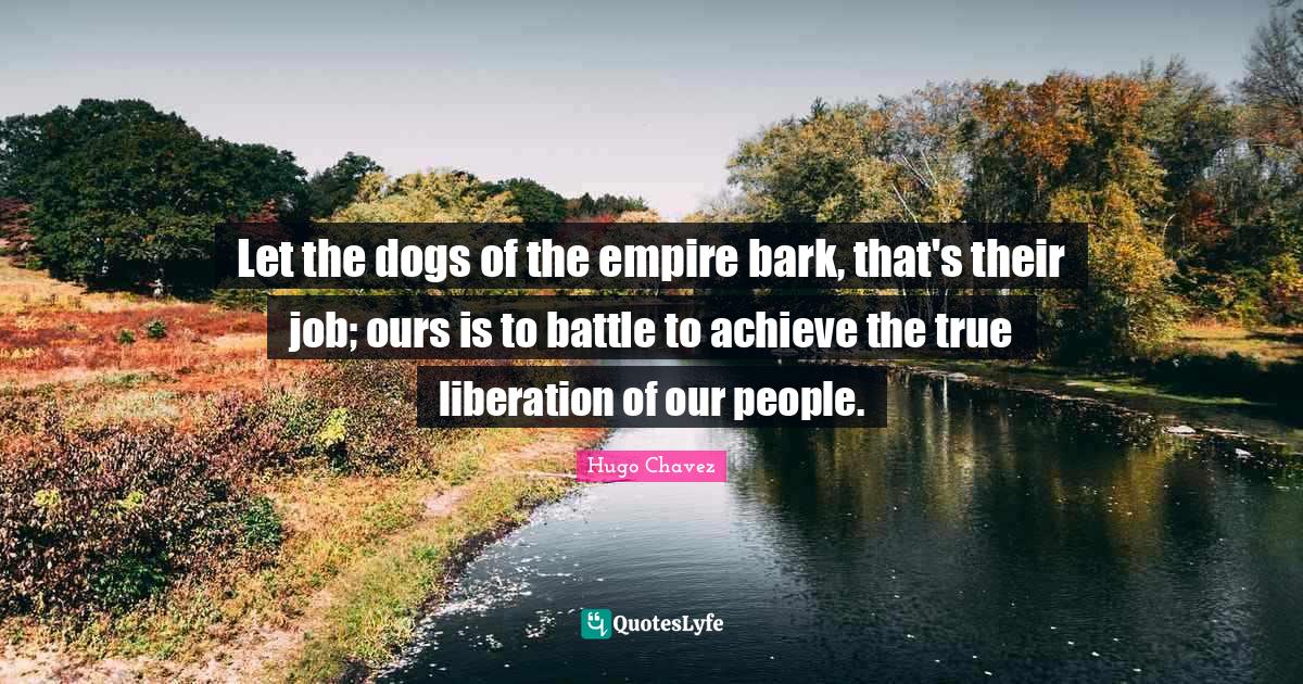 This page presents the quote "Let the dogs of the empire bark, that's their job; ours is to battle to achieve the true liberation of our people.". Author of this quote is Hugo Chavez. This quote is about achieve, people, jobs, dog, battle, liberation, bark,.